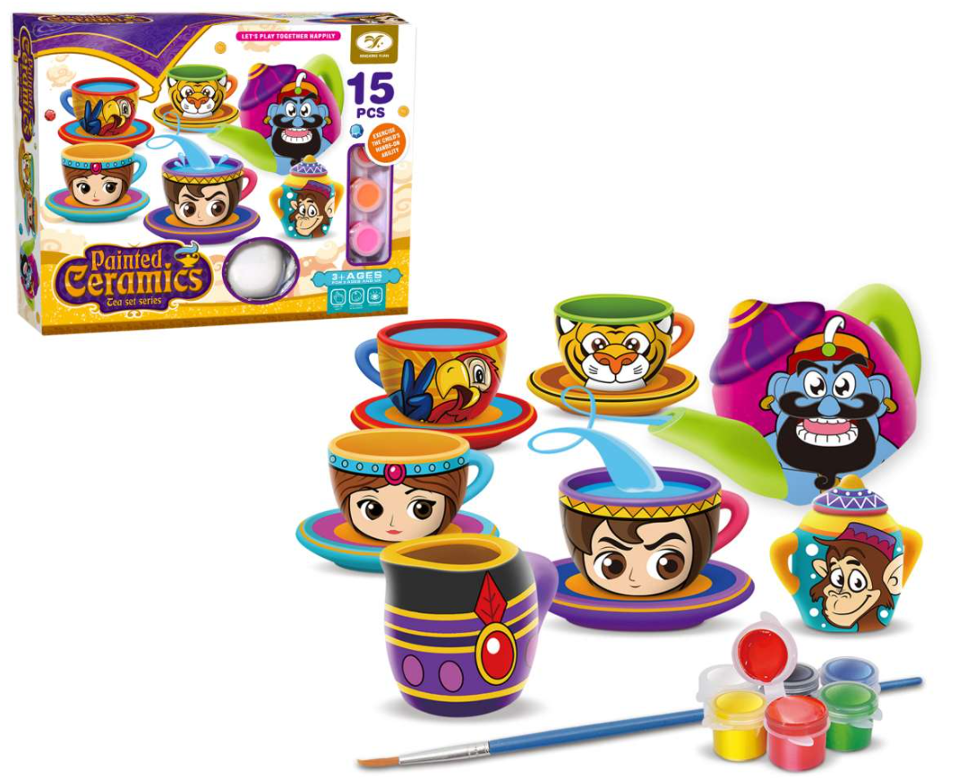 Step into a world of wonder with the Painted Ceramics Tea Set, inspired by the enchanting tales of Aladdin. This creative kit invites children to paint their own miniature tea set, featuring characters and motifs drawn from Middle Eastern folklore.