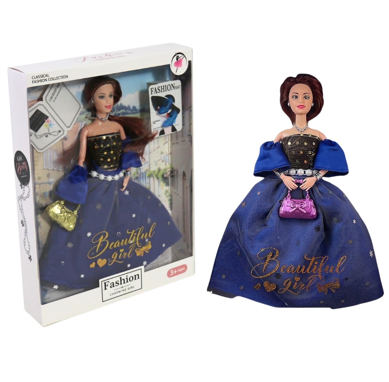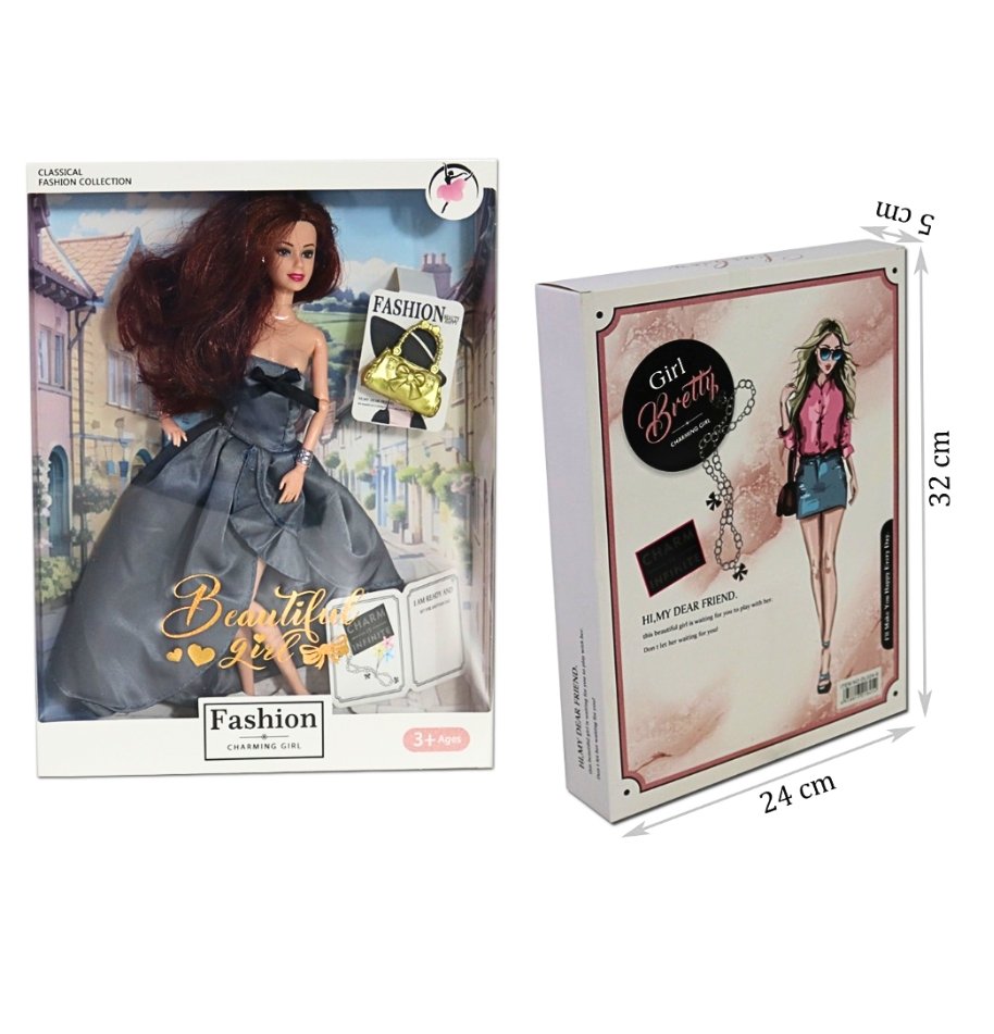 The “Fashion Charming Girl” doll wears a stunning dark gray gown and comes with a handbag and shoes, while the “Girl Pretty” box showcases a fashionable illustration and playful packaging. With vibrant colors and detailed accessories, this set is ideal for kids who love dressing up and creating their own fashion stories.