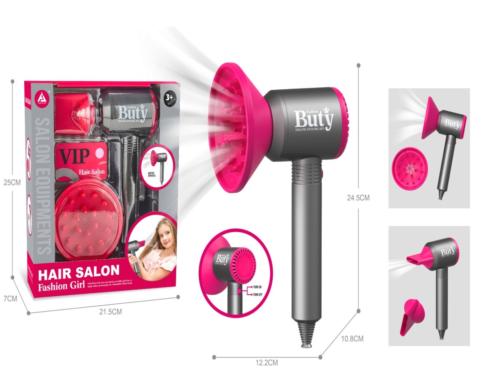 – 🎀 تصميم بعلامات تجارية محفزة: مطبوع عليه شعارات مثل “Buty Fashion Girl” و”VIP Hair Salon” لتجربة لعب مفعمة بالأناقة