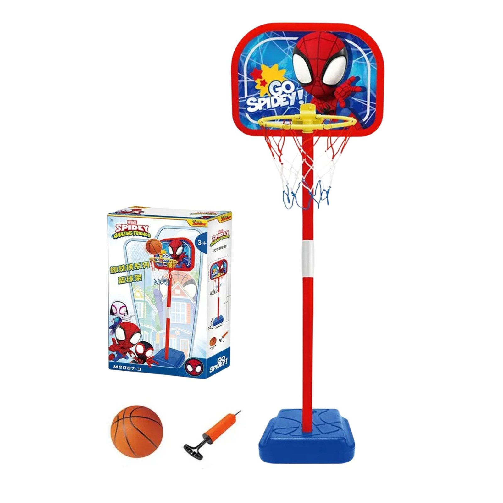 – 🏀 السلة: حمراء وزرقاء مع لوحة خلفية تحمل عبارة “GO SPIDEY!” وصورة سبايدرمان